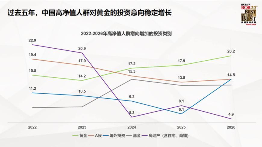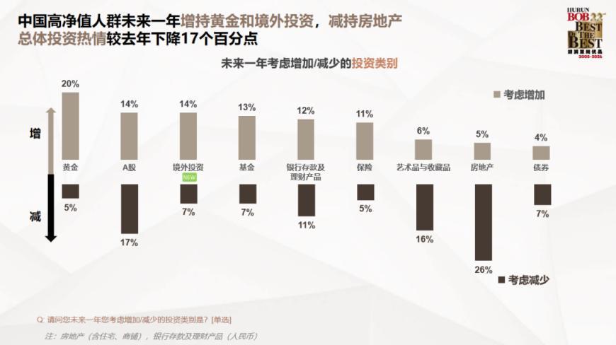 敷陈露馅,从净增长/减少意向(即加多者比例与减少者比例相减)来看,高净值东谈主群往常一年对黄金投资的净增长意向达15%,增握意愿明显。境外投资的净增长意向为7%,基金和保障投资的净增长意向均为6%,合座上比拟倾向于增握。房地产投资的净减少意向为21%,艺术品与储藏品投资的净减少意向为10%,减少支拨的意愿明显。A股的净减少意向为3%,银行进款(及答理家具)的净增长意向为1%,增减意愿分化。