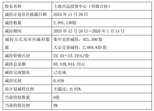 2025年12月26日至2026年1月14日,共远投资通过麇集竞价表情减捏公司股份921,300股,占公司总股本的0.20%,通过巨额交游表情减捏公司股份2,069,830股,占公司总股本的0.45%,共计减捏2,991,130股,占公司总股本的0.65%。减捏总金额为68,438,944.70元,本次减捏已完成。